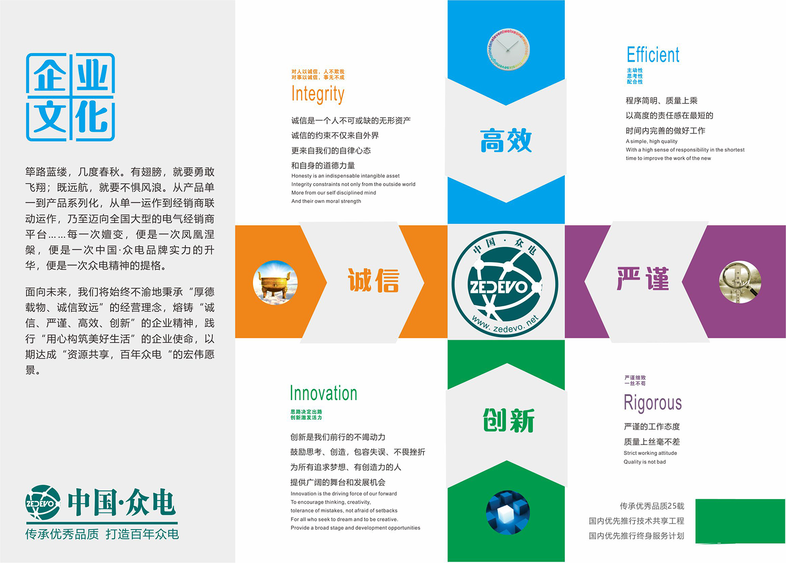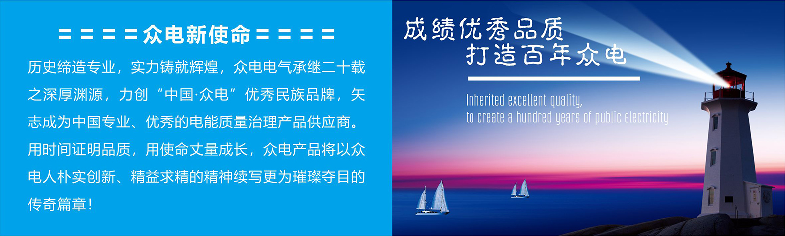 中国众电从创建至今,一直坚持以发展高端技术来满足市场的需求变化,提供满足各种工况需求的精品产品。目前已形成ZED系列智慧配电产品、ZD系列电能质量治理产品等比较完整的智慧电器产品链,产品品质卓越、工艺精湛、外形典雅和安全耐用。在经营过程中严格执行ISO9001质量体系标准,产品取得中国强制性认证和相关国际认证,有效地保证了产品的先进性、可靠性。并历经数年的励精图治,通过为全球各行业用户提供创新技术与面向未来物联的产品解决方案,让用户享有安全、可靠、清洁的电力能源。